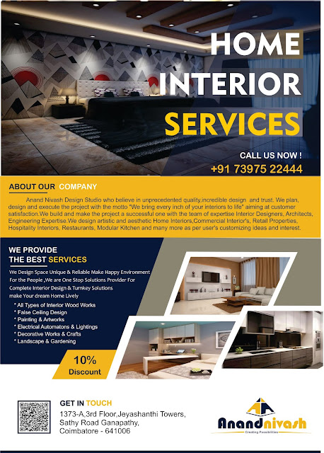 "Your home should tell the story of who you are, and be a collection of what you love". Book your world dream : 7397147442 , 7397522444. Mail id : anandnivashinterior@gmail.com Website : www.anandnivash.com Location :1373-A,3rd Floor,Jeyashanthi Towers,Sathy Road,Ganapathy, Coimbatore-641 006.